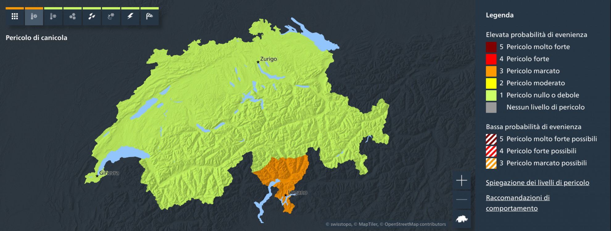Raccomandazioni di comportamento - Per tutta la durata dell'allerta MeteoSvizzera consiglia alla popolazione di «assumere liquidi a sufficienza», almeno 1,5 litri al giorno, «evitare gli sforzi fisici», «mangiare cibi freschi e leggeri», «proteggersi dai raggi diretti del sole», stando all’ombra e indossando indumenti e copricapi, «rinfrescare il più possibile il corpo e gli edifici» e infine non «lasciare animali o persone all'interno dei veicoli».