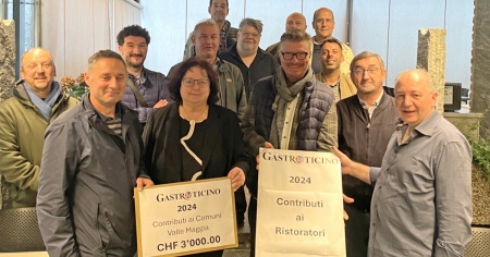 CEVIO - GastroTicino (con le Sezioni regionali e GastroSuisse) ha deciso di versare ai Comuni della Vallemaggia e ai soci ristoratori della valle locarnese e della Mesolcina danneggiati dal maltempo, un importo totale di 24mila franchi. La consegna simbolica degli aiuti è stata effettuata ieri, lunedì 23 settembre, all’Osteria Castello di Cevio. Oltre al Consiglio d’amministrazione di GastroTicino, presieduto da Massimo Suter, erano presenti i sindaci di Cevio, Wanda Dadò, e di Lavizzara, Gabriele Dazio.