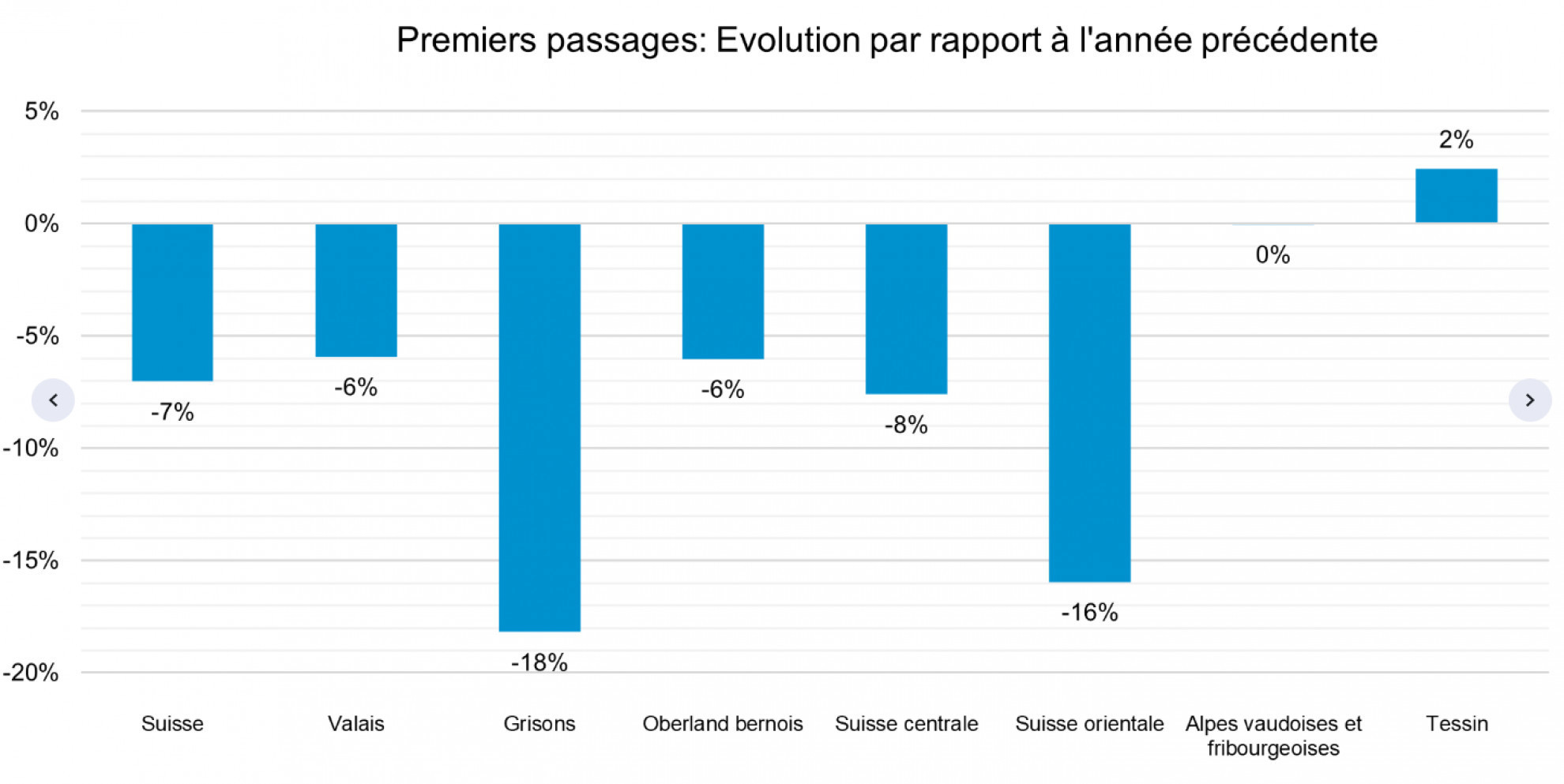 Anche le differenze regionali sono importanti. Nel confronto con il 2023 i Grigioni segnano -18% e la Svizzera orientale -16%; più ridotto è stato lo scarto osservato nella Svizzera centrale (-8%), in Vallese (-6%) e nell'Oberland bernese (-6%). Le Alpi vodesi e friburghesi marciano perfettamente sul posto, mentre il Ticino mette a referto una lieve progressione (+2%).