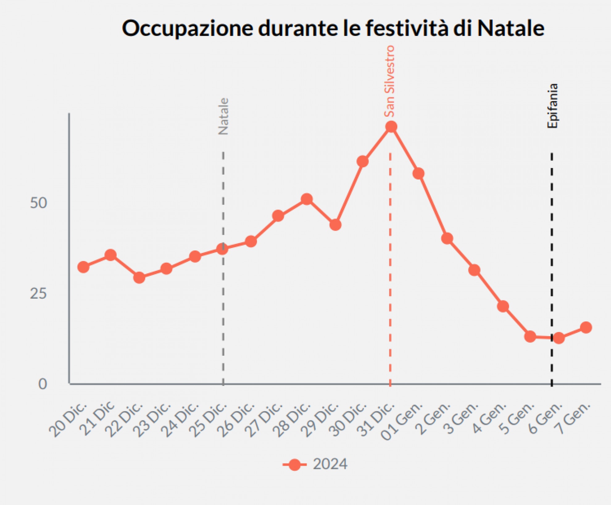 Occupazione media - A cinque giorni dal Natale, per le festività natalizie 2024, si prospetta un' occupazione media al 37.1%, superiore a quella del 2023 e 2022.