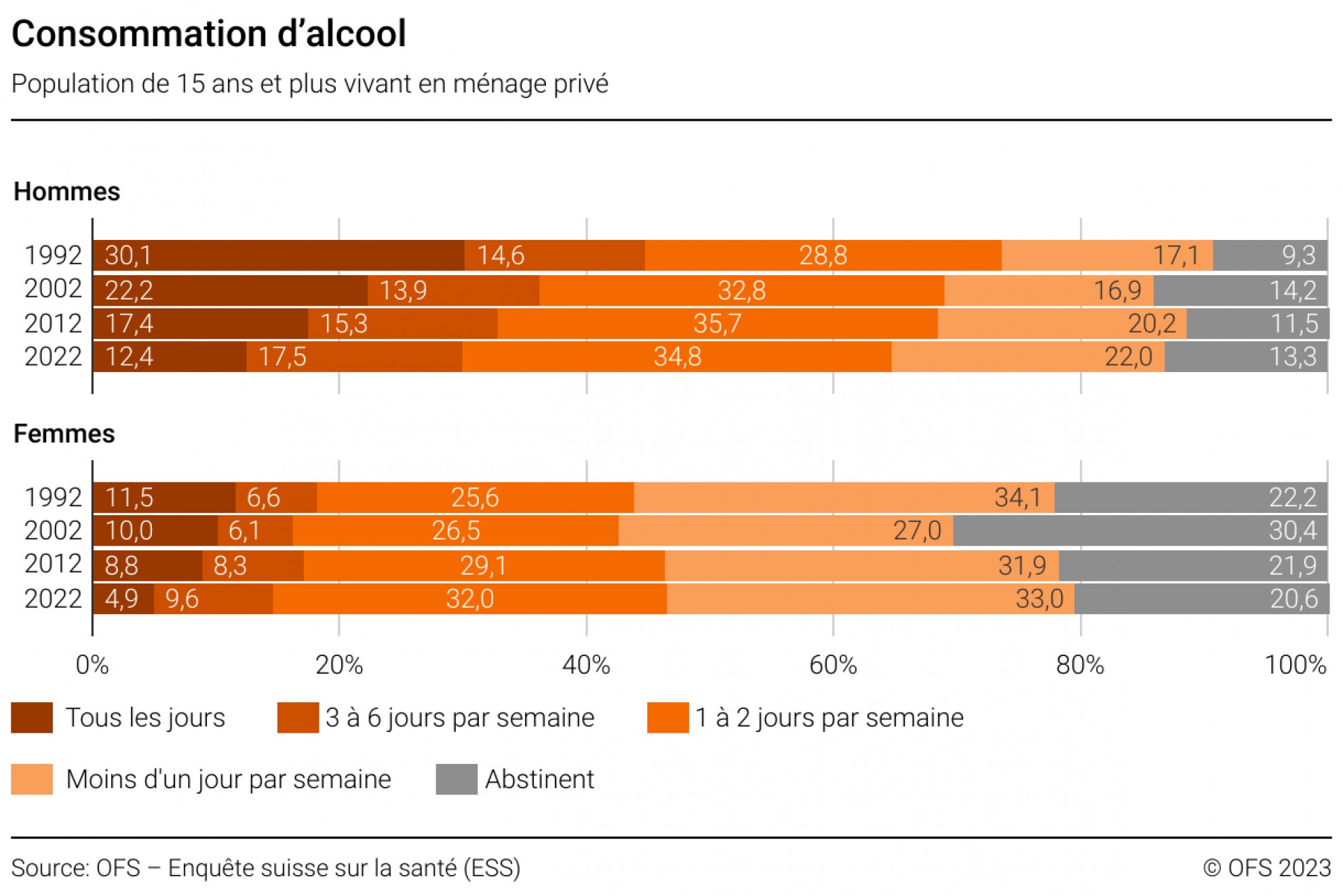 LUGANO - “Stessa storia, stesso posto, stesso bar” cantavano gli 883 in uno dei loro brani più iconici. La storia però, al bar, sembrerebbe essere cambiata. E non in meglio (almeno non per i gestori dei locali). Il consumo di alcol in Svizzera sta infatti diminuendo. Lo dicono i dati dell’Ufficio federale di Statistica. In un’inchiesta pubblicata nel 2022 “solo” l’8,6% della popolazione svizzera ha consumato alcol almeno una volta al giorno. Una quota fortemente diminuita dal 1992 (20,4%) e il consumo è passato a una o più volte a settimana.