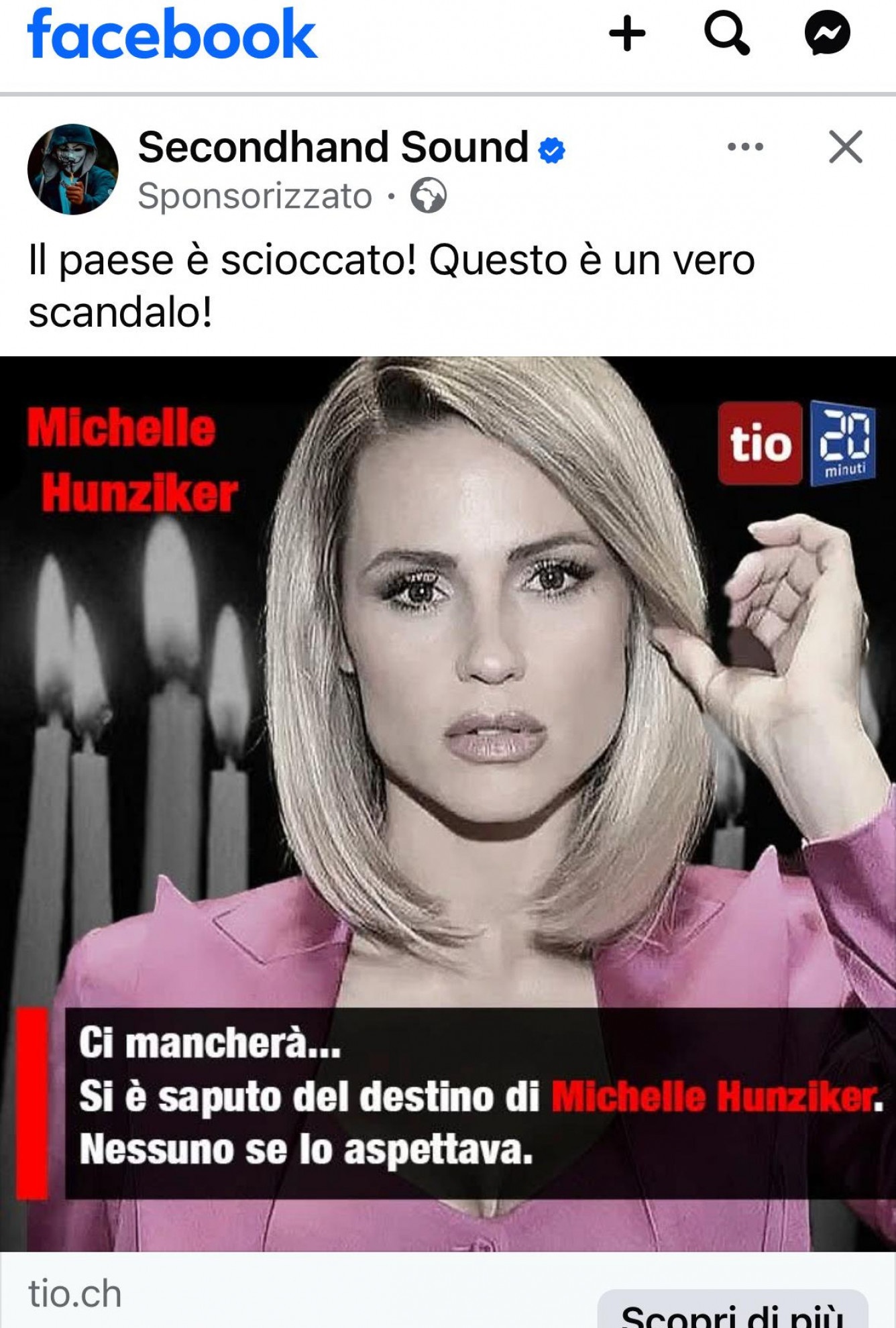 Il finto pezzo ritrae Michelle Hunziker accompagnata da frasi come «Il paese è scioccato! Questo è un vero scandalo!». È una truffa.