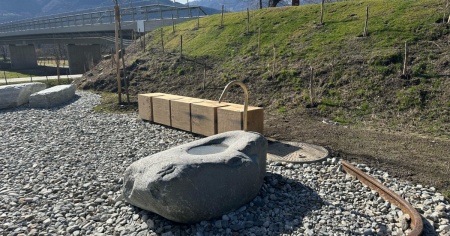 «Tra le novità più apprezzate, spicca un rifugio per insetti, pensato appositamente per favorire la vita di questi piccoli ma fondamentali esseri viventi». A questo si aggiunge una fontana e delle sedute in pietra, le cui superfici sono state naturalmente levigate dallo scorrere del fiume Maggia. «Questi elementi fungono quale punto di ristoro per i ciclisti, che possono così rinfrescarsi e godere di una sosta nel cuore della natura. Il tratto di ciclopista è stato arredato con una variegata piantagione di arbusti e alberi autoctoni, unitamente a prati fioriti. Non meno importante è la presenza di un simbolo del passato che si fonde con il presente: un pezzo di binario arrugginito, testimonianza dei vagoni che trasportavano il materiale ai tempi della grande bonifica del Piano di Magadino».
