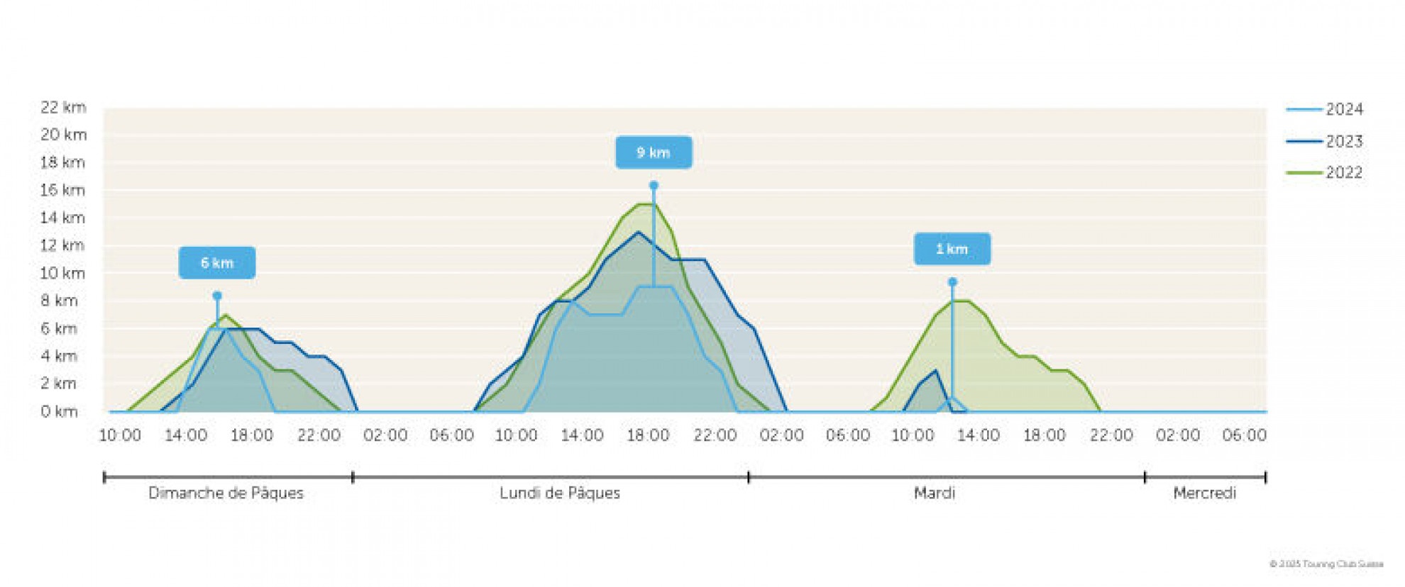 TCSChilometri di coda al portale sud del Gottardo a Pasqua: panoramica 2022-2024.