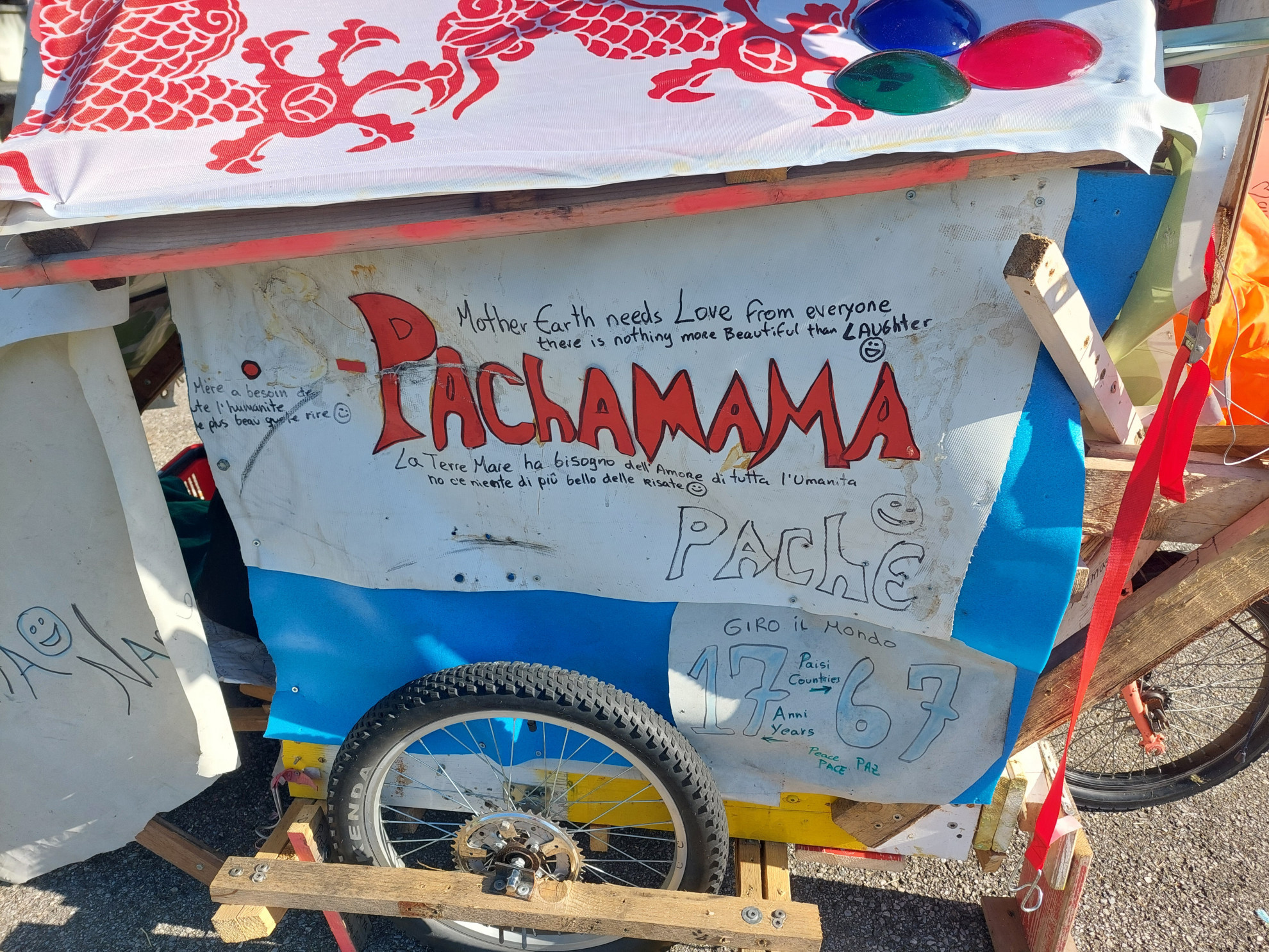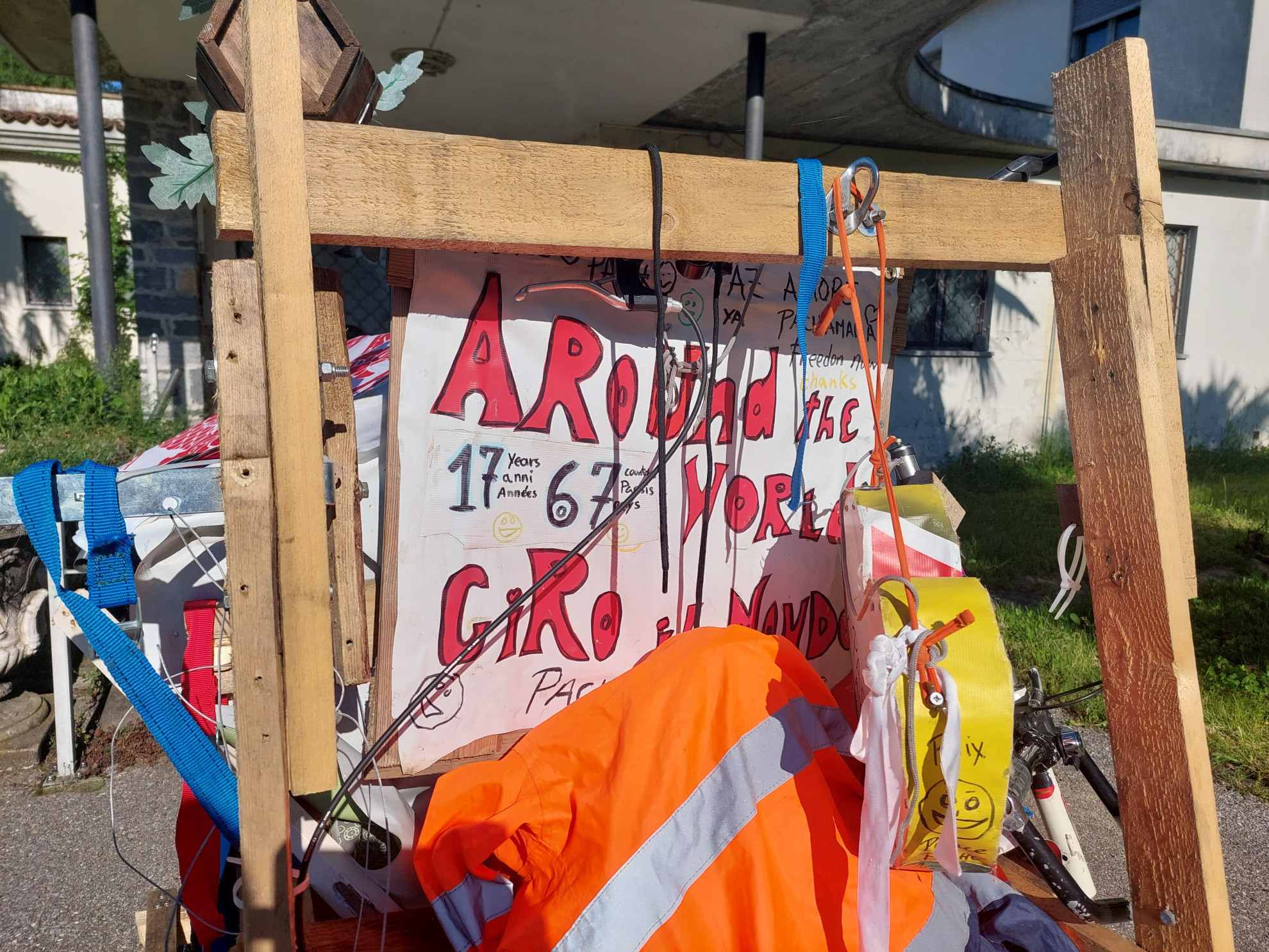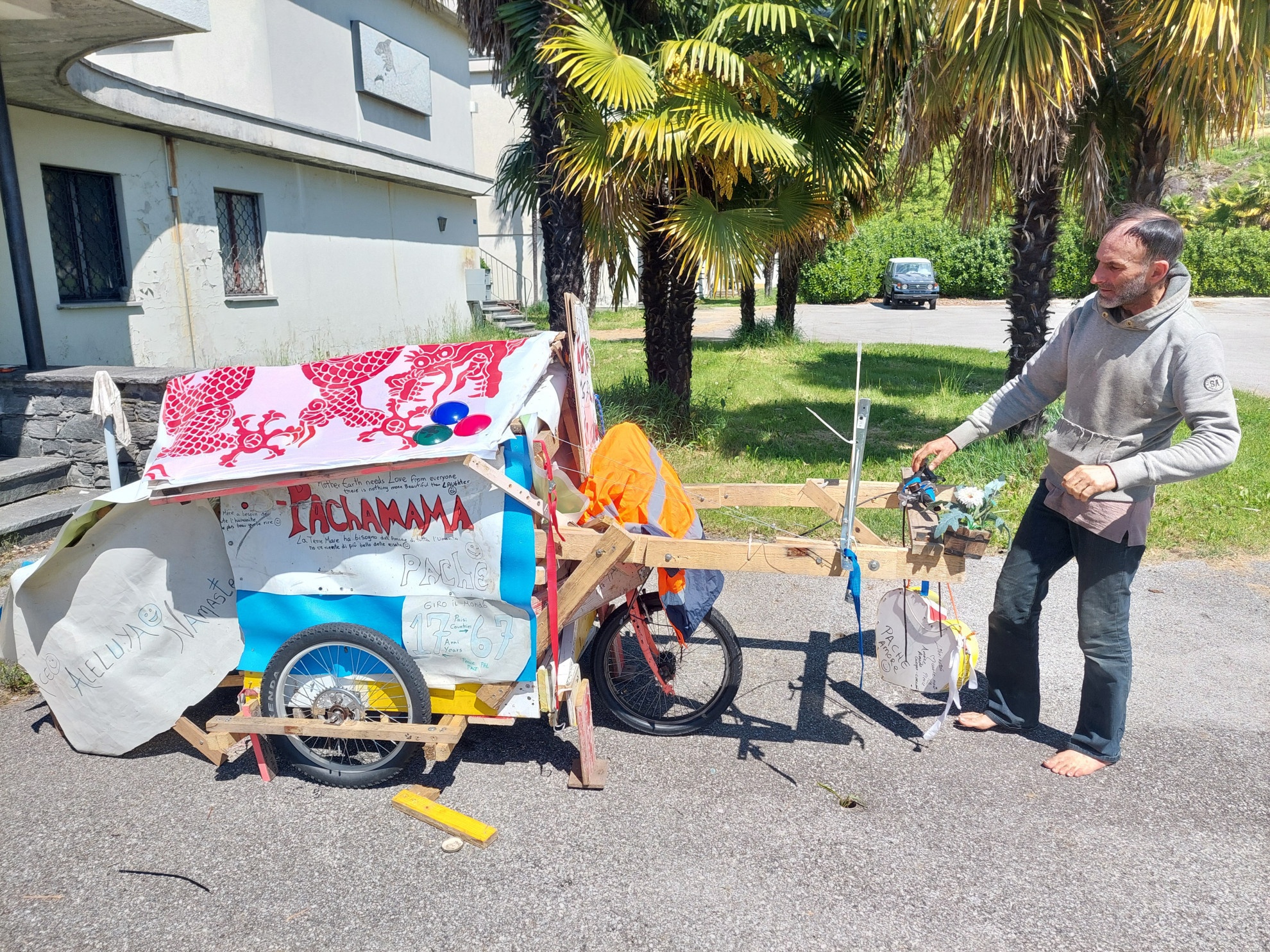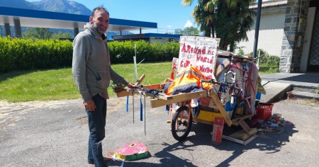 «Questa è la comodità» – Il suo mezzo di trasporto è bizzarro. Una bicicletta che traina una specie di capanna in cui è contenuta anche la sua camera da letto. «Qui dentro c'è tutto quello che mi serve. Anche il materasso. Ovviamente devo aprire il retro della casetta in legno per potere allungare le gambe. Le comodità non mi mancano. Anzi. Per me è questa la comodità. Nessuno mi dice cosa devo fare».