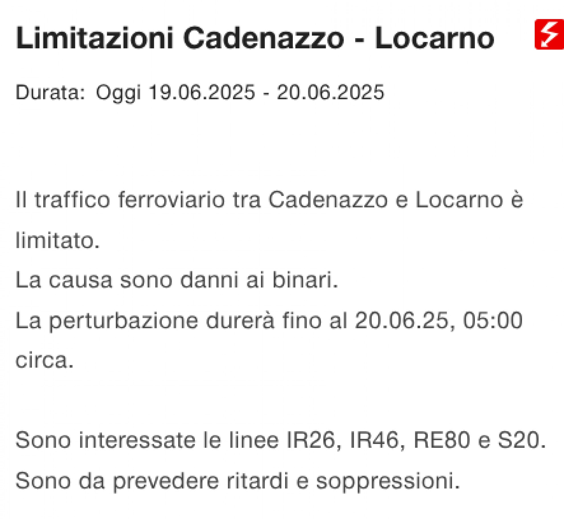LOCARNO - A causa di «danni ai binari», il traffico ferroviario fra Cadenazzo e Locarno è limitato.