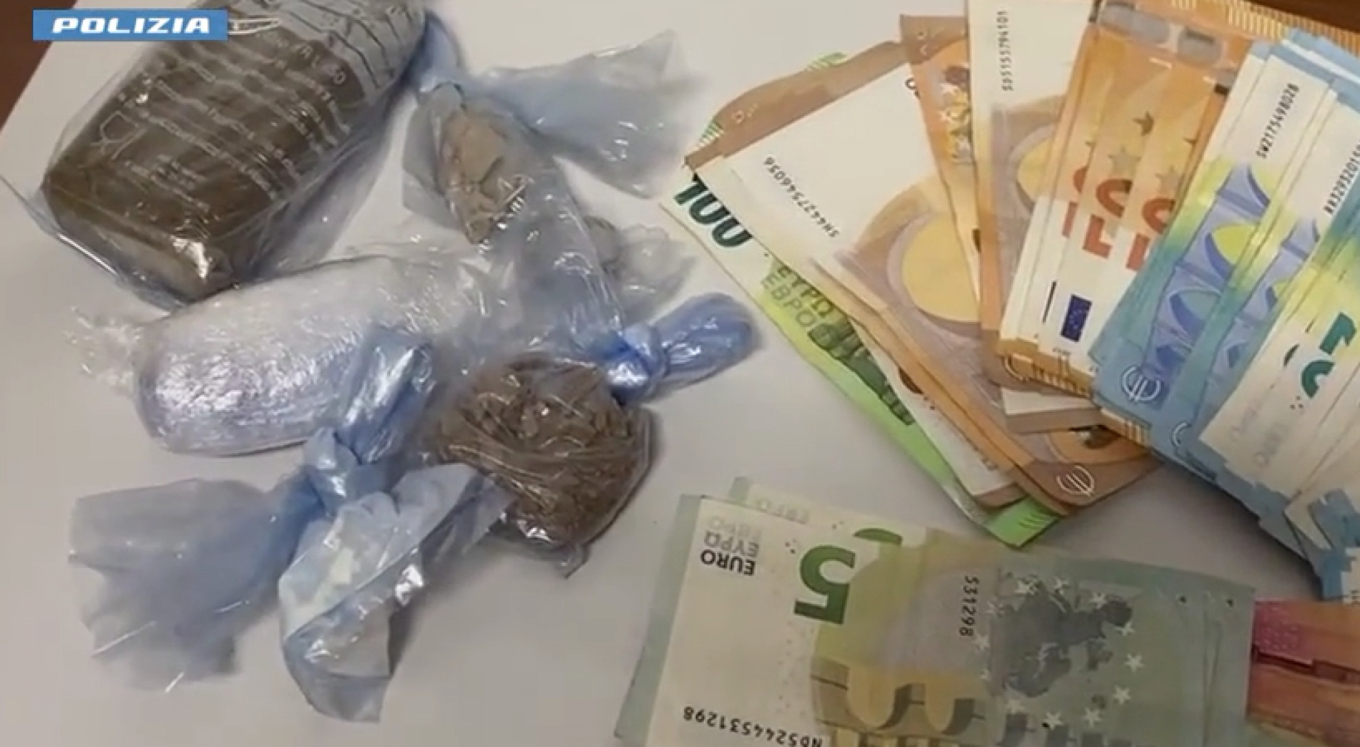 Durante l’intervento, gli agenti hanno recuperato un marsupio abbandonato dall’uomo, contenente 21,5 grammi di eroina, 38 grammi di cocaina, 100 grammi di hashish e 1.630 euro in contanti, presumibilmente provento dell’attività di spaccio.
