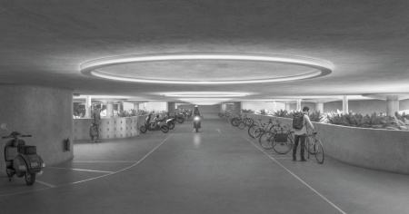 Il disegno delle chiome degli alberi caratterizza la nuova spazialità del piazzale, con un progetto urbano su scala umana che valorizza il contesto degli edifici adiacenti. Il collegamento con il livello inferiore è dato dalla continuità visiva tra il piano del parcheggio cicli a quello del piazzale, che porta luce e ventilazione naturale alla parte interrata. È mantenuta una superficie generosa fruibile per eventi e manifestazioni.