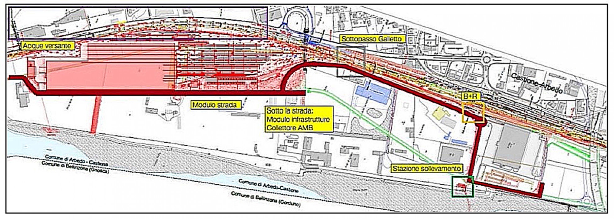 L’esecuzione del progetto NSIF comporta un riassetto della viabilità della zona industriale di Castione, nonché il dislocamento di numerose infrastrutture di terzi. In tale ambito, FFS SA, il Comune di Arbedo-Castione e il DT hanno ritenuto opportuno, dal punto di vista procedurale ed economico, «integrare e anticipare nel progetto NSIF anche ulteriori opere e interventi di interesse pubblico, e in particolare l’ampliamento e il miglioramento della viabilità, l’ampliamento della stazione di sollevamento delle acque di versante, la costruzione di un nuovo sottopasso ciclopedonale e l’allestimento di un’area bike and ride, in sostituzione dell’infrastruttura esistente, considerata obsoleta».
