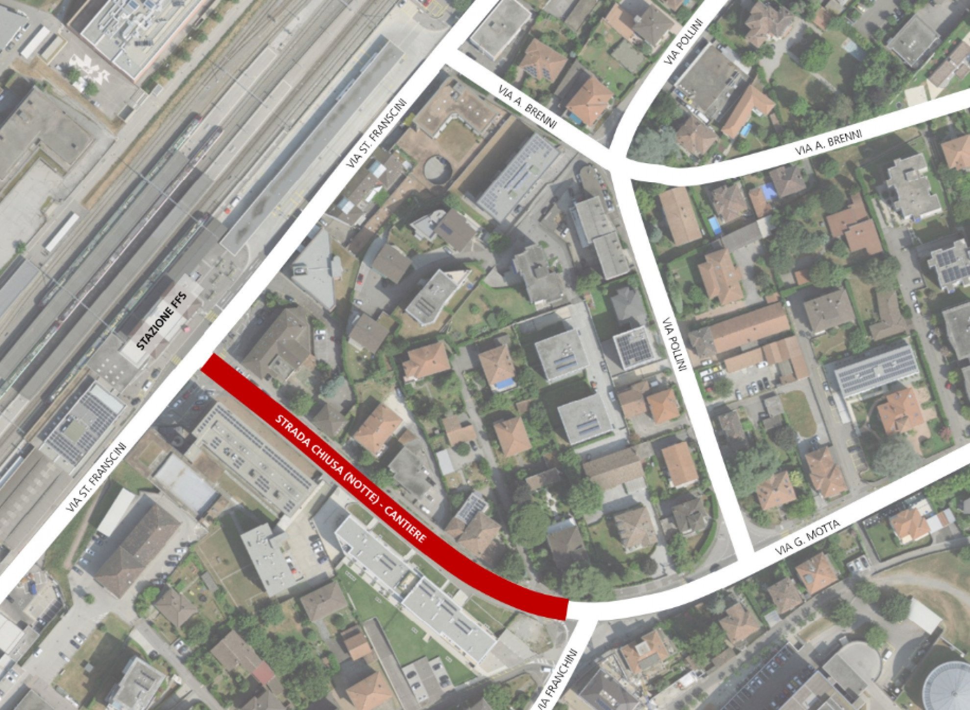 Durante i lavori il trasporto pubblico non avrà la possibilità di transitare lungo Via Motta (parte bassa) nella fascia oraria 20:00 - 06:00 e verrà deviato su Via Pollini.