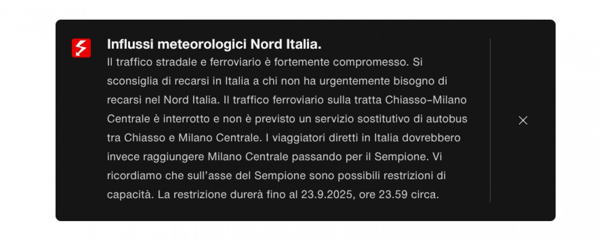 Il traffico ferroviario sulla tratta Chiasso–Milano Centrale «è interrotto e non è previsto un servizio sostitutivo di autobus tra Chiasso e Milano Centrale». I viaggiatori diretti in Italia dovrebbero invece raggiungere Milano Centrale passando per il Sempione. «Vi ricordiamo che sull’asse del Sempione sono possibili restrizioni di capacità. La restrizione durerà fino a domani alle ore 23.59 circa».