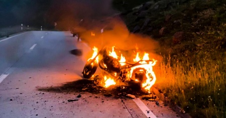 BEDRETTO - Un po' di fumo dal motore. E poi le fiamme che hanno completamente avvolto e distrutto una motocicletta immatricolata in Germania. L'incendio si è verificato oggi attorno alle 21 lungo la strada del Passo della Novena, in zona Alpe di Cruina.