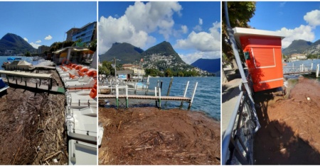 Una chiazza scura, densa di resti di legname che - spinti dall'impeto del maltempo - hanno percorso chilometri fino a raggiungere il centro della città. Fortunatamente, almeno per quanto riguarda il Luganese, senza provocare troppi danni.