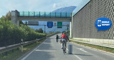 Malgrado a pochi metri di distanza vi fosse una pista ciclabile, infatti, due persone (verosimilmente non del luogo) hanno deciso di imboccarla... in sella alla loro bicicletta. Uno di loro, non contento, portava con se addirittura un trolley.