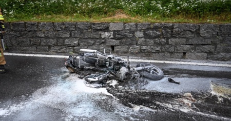 ACQUAROSSA - Si è concluso con l'incendio di una moto l'incidente avvenuto questa mattina poco prima delle 6 sulla strada cantonale a Lottigna, in territorio di Acquarossa in Val di Blenio.