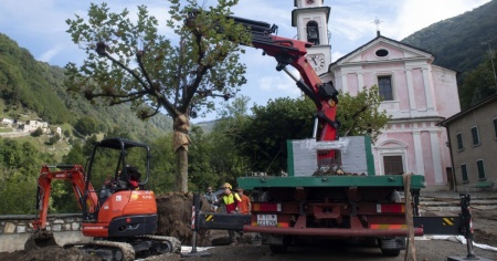 BREGGIA - Alcuni esemplari di tiglio e platano stanno tornando nella rinnovata piazza di Cabbio, in Valle di Muggio. La messa a dimora delle piante è cominciata oggi e durerà alcuni giorni.