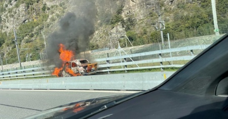 BELLINZONA - Fiamme in autostrada oggi pomeriggio. Un'auto ha preso fuoco attorno alle 14.00 sull'autostrada A2 in direzione nord, all'altezza di Pollegio. I video e le foto giunte in redazione mostrano un'alta colonna di fumo e il veicolo - una vecc...