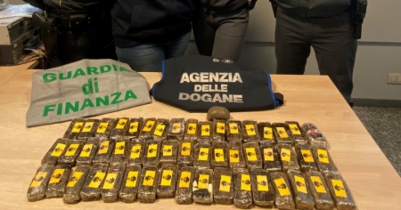 Nel corso dei controlli di routine, il 57enne non aveva dichiarato nulla. Tuttavia i funzionari doganali e i finanzieri non si sono lasciati convincere e hanno deciso di procedere a un controllo più approfondito con l'ausilio dell'unità cinofila. E proprio il fiuto del cane "Anima" ha permesso di rinvenire la sostanza stupefacente che l'uomo trasportava nel suo bagaglio personale. Suddivisa in 52 panetti, la merce al dettaglio avrebbe avuto un valore di circa 52mila euro.