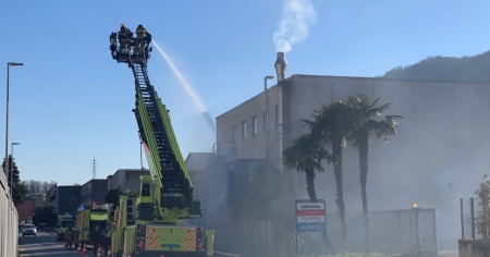 RIVA SAN VITALE - Intervento dei pompieri del centro di soccorso del Mendrisiotto, oggi pomeriggio attorno alle 15.00, in uno stabilimento di via Industria a Riva San Vitale.