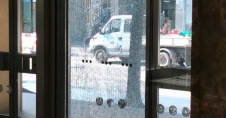 Qualcuno ha lanciato un sampietrino contro l'ingresso dell'edificio. La polizia ha fermato l'autore del gesto