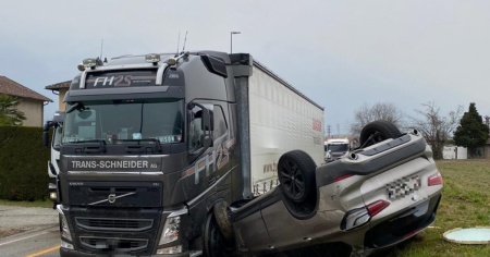 Urta il camion e si ribalta