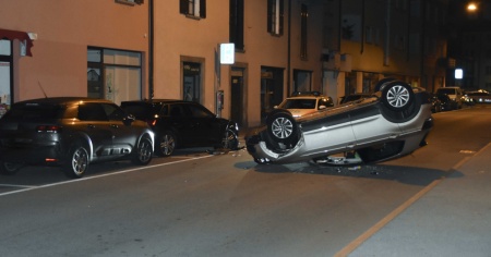 Urta un’auto parcheggiata e si rovescia sul tetto