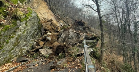 La via è completamente ostruita dall'enorme roccia che ha distrutto guard rail e manto stradale