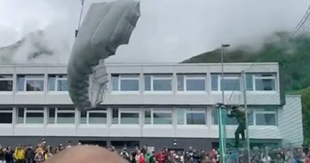 Un video girato da un lettore-reporter di Blick riprende l'attimo in cui il paracadutista, durante la fase finale dell'atterraggio, finisce accidentalmente in una rete posta nei pressi del campo di calcio adiacente. La sua discesa precipitosa ha portato al suo impigliarsi nella struttura, lasciandolo momentaneamente sospeso in aria.