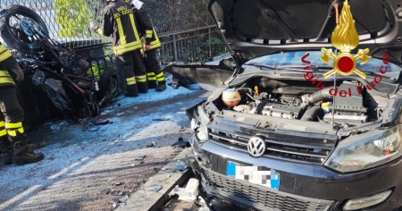 Scontro con un'auto, moto in fiamme: grave un 25enne
