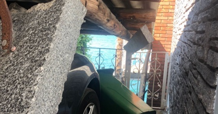 Le fotografie giunte in redazione mostrano la vettura rimasta incastrata sotto il peso della struttura. Le colonne di granito sono crollate rompendosi in più pezzi.