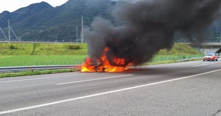 CAMORINO - Un'auto ha preso fuoco questo pomeriggio, poco dopo le 16.00, nei pressi dello svincolo autostradale di Bellinzona-Sud in direzione della galleria del Monte Ceneri.