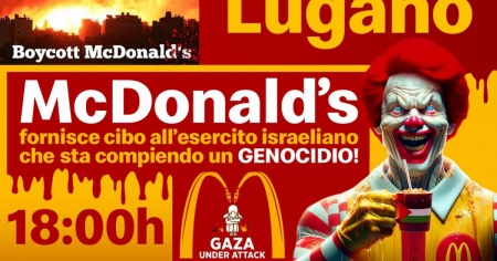 LUGANO - Un flashmob davanti al Mc Donald's in centro a Lugano «per ribadire nuovamente il pieno sostegno al popolo palestinese e per denunciare l’occupazione, i bombardamenti e i blocchi che da decenni seminano solo morte e devastazione in Palestina».
