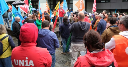 A organizzarla sono i sindacati italiani Cgil, Cisl e Uil e le sigle elvetiche Ocst, Unia, Sgb Uss e Syna. Fuori dal "Pirellino", come viene chiamata la sede regionale comasca, si sono radunate - nonostante la pioggia quasi ininterrotta - almeno 300 persone. Moltissime le bandiere sindacali (ce n'era perfino una vallesana) e altrettanti i rappresentanti delle varie sigle, per quella che è - come è stato ribadito più volte - la prima manifestazione internazionale contro un tema che sta facendo molto discutere che tocca la vita di decine di migliaia di persone. Presenti anche svariati politici, sia italiani che ticinesi: gli esponenti del PD Chiara Braga, Luca Gaffuri e Angelo Orsenigo, così come il segretario VPOD e Municipale di Lugano Raoul Ghisletta.