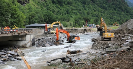 I lavori procedono a pieno regime tra camion, ed escavatori - alcuni dei quali con i cingoli nell'acqua -, intenti a ripulire l'area e ripristinare il flusso della Moesa in modo tale da scongiurare eventuali pericoli in caso di nuove alluvioni.