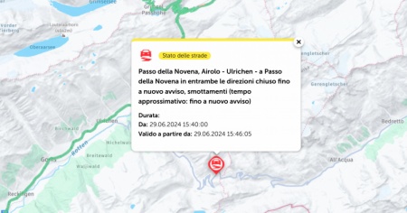 ULRICHEN (VS) - La strada del Passo della Novena, che collega l'Alto Vallese con la Valle Bedretto in Ticino, è stata interrotta a causa una frana sabato all'ora di pranzo. Secondo il Touring Club Svizzero (TCS), l'incidente si è verificato in cima al passo.