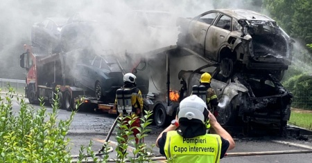 SOAZZA - Una bisarca ha preso fuoco intorno alle 14:00 sulla A13 a Soazza. Come si vede dalla foto inviata da un lettore alla redazione di TIO, tutte le macchine che l'autotreno immatricolato in Polonia trasportava sono state avvolte dalle fiamme.