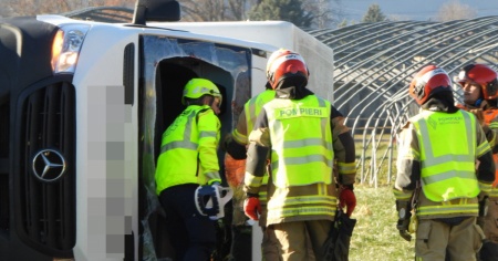 Dopo lo scontro si rovescia sul fianco e il conducente resta intrappolato