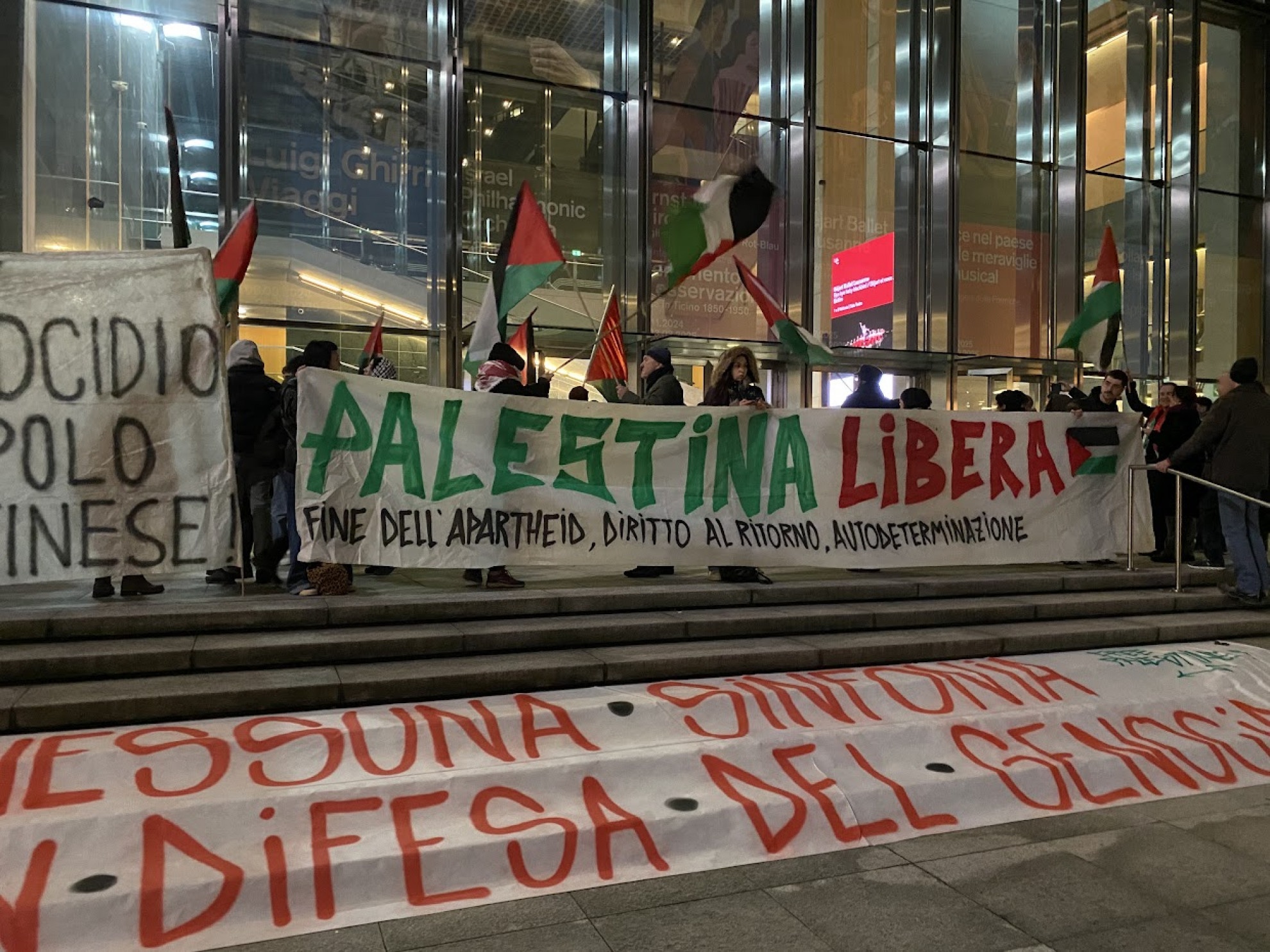 Erano presenti un centinaio di persone, sia giovani che meno, con striscioni e bandiere palestinesi. Hanno rivolto urla a chiunque entrasse al concerto. «Vergogna», hanno gridato a tutti, accusandoli di essere «fascisti e assassini». Tra gli slogan, anche «Israele fascista, stato terrorista».