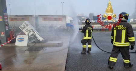 COMO - Intervento provvidenziale dei Vigili del Fuoco di Como questa mattina in A9 (direzione Sud), nell'area di servizio Lario Ovest. I soccorritori sono stati allertati dopo che un camion in manovra, intorno alle 7.45, ha urtato e distrutto una colonnina della distribuzione di GPL.