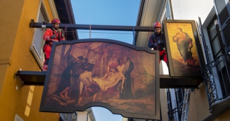 I grandi Trasparenti che caratterizzano le Processioni della Settimana Santa di Mendrisio vengono infatti affissi e raccontano la storia di una tradizione vivente che dura da oltre 400 anni e che nel 2019 è stata iscritta nella prestigiosa lista rappresentativa dei beni immateriali culturali dell’UNESCO.