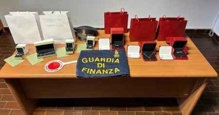Il ritrovamento delle scatole ha indotto i finanzieri ad approfondire l’ispezione sui soggetti, che ha consentito di rinvenire nella borsa della donna 5 bracciali e 3 collane e nella tasca interna della giacca dell’uomo le relative garanzie.