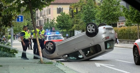 LUGANO - Un'auto si è cappottata oggi, sabato 17 maggio, nel tardo pomeriggio, a Lugano, in Viale Stefano Franscini.
