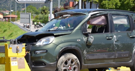 Dopo lo scontro, l'auto si rovescia: intrappolata la conducente