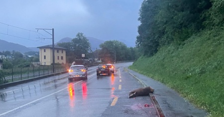 L'animale è finito addosso alle due vetture ed è morto sul colpo. Per gli occupanti dei veicoli invece solo un grande spavento e danni materiali.