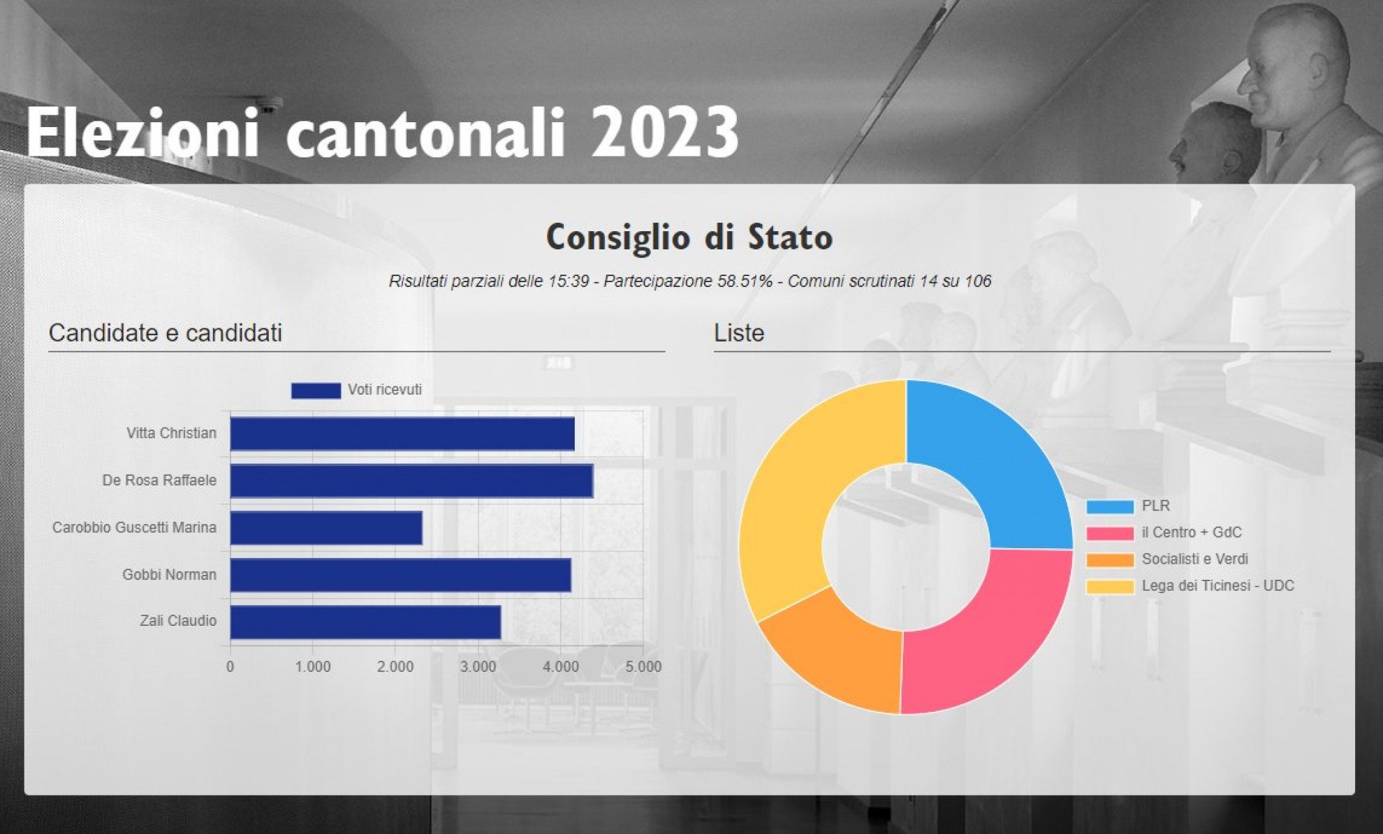 Dopo 90 comuni scrutinati su 106, la lista Lega-UDC comanda sempre con il 27,63% delle preferenze. Il PLR è secondo con il 22,94% dei voti, seguono il Centro con 18,30% e la Lista PS-Verdi con il 17,04%. Avanti con Ticino & Lavoro si attesta invece al 5,18%. Christian Vitta resta il politico più votato (51'877 preferenze), tallonato da Norman Gobbi (48'225) e Raffaele De Rosa (43'781).